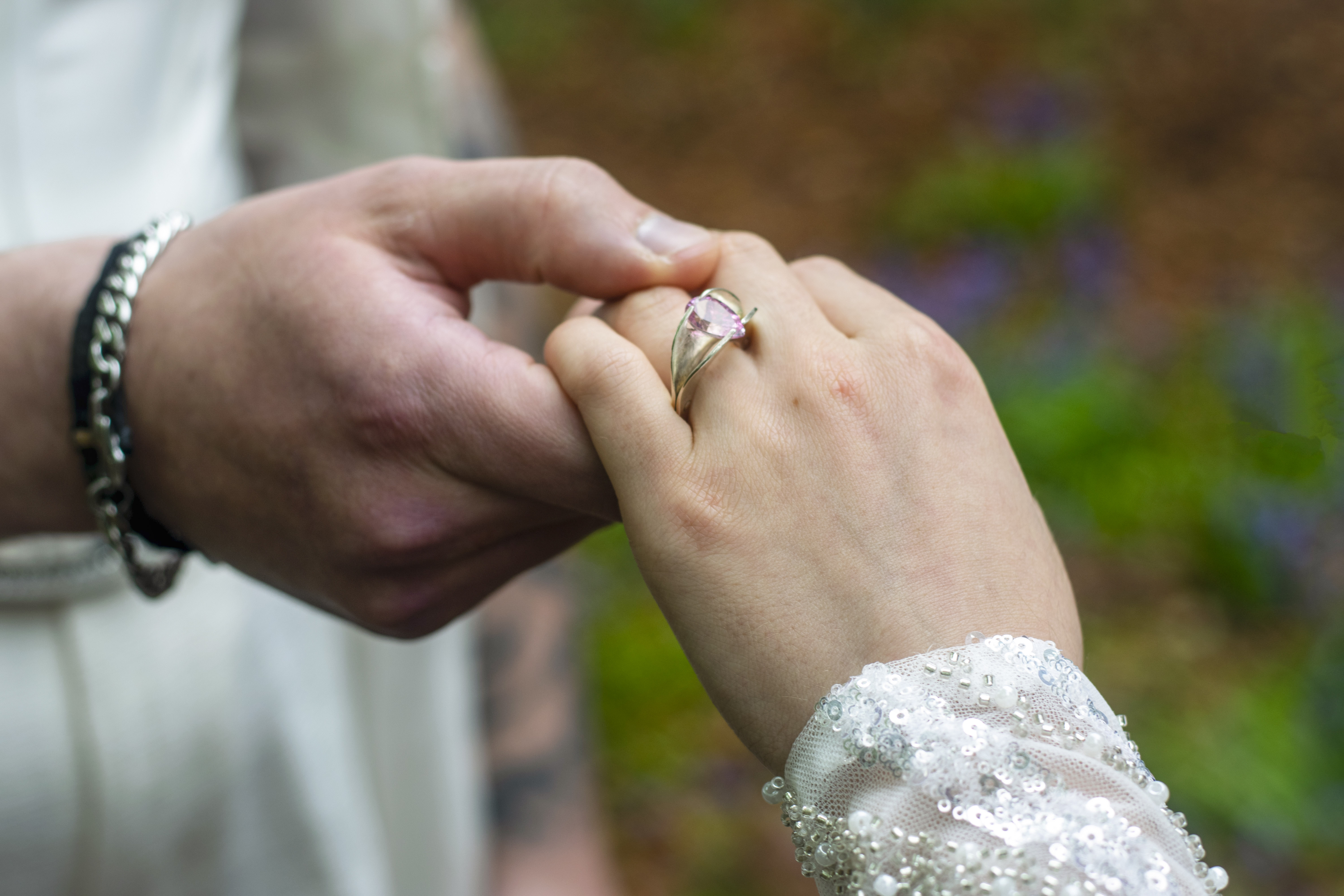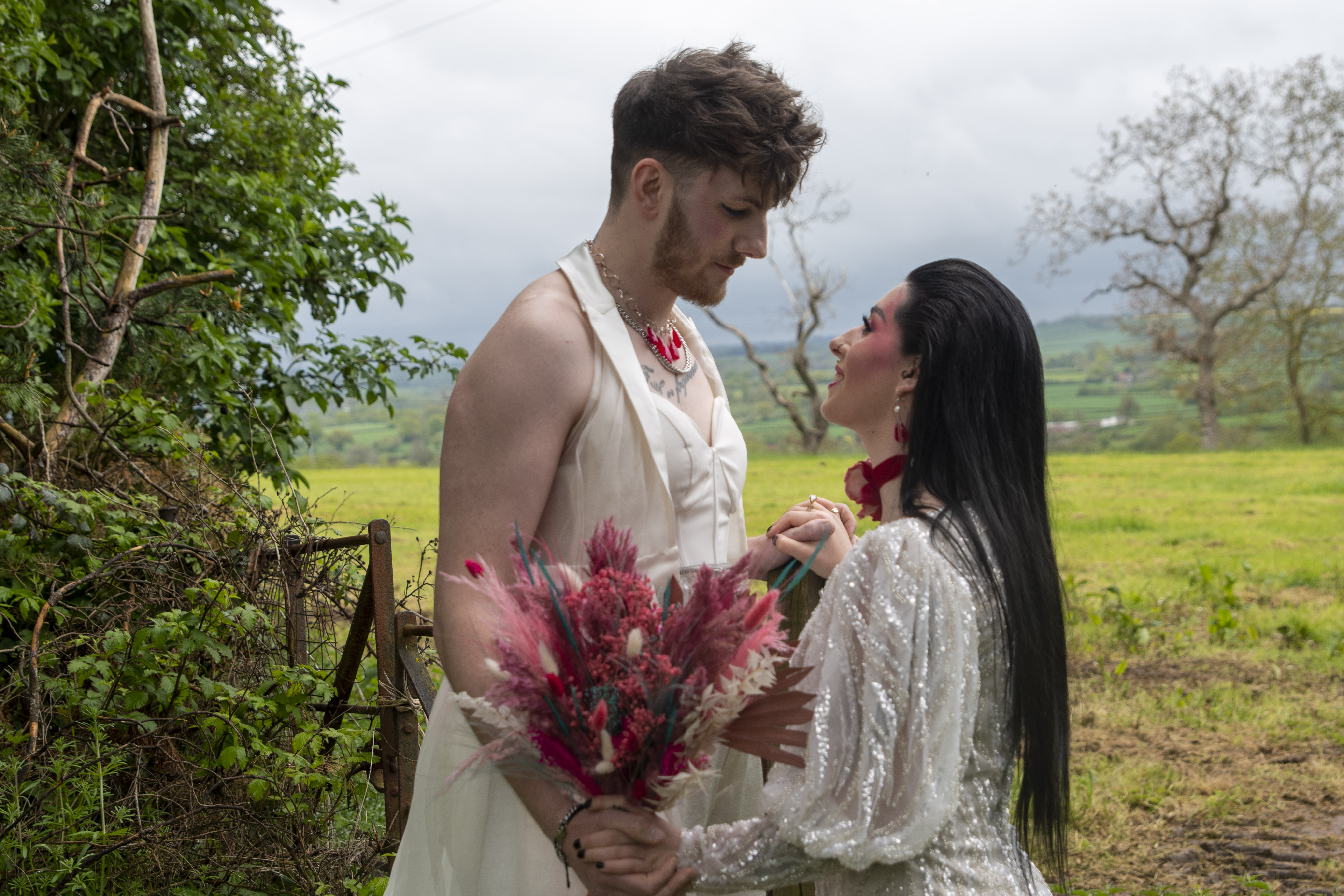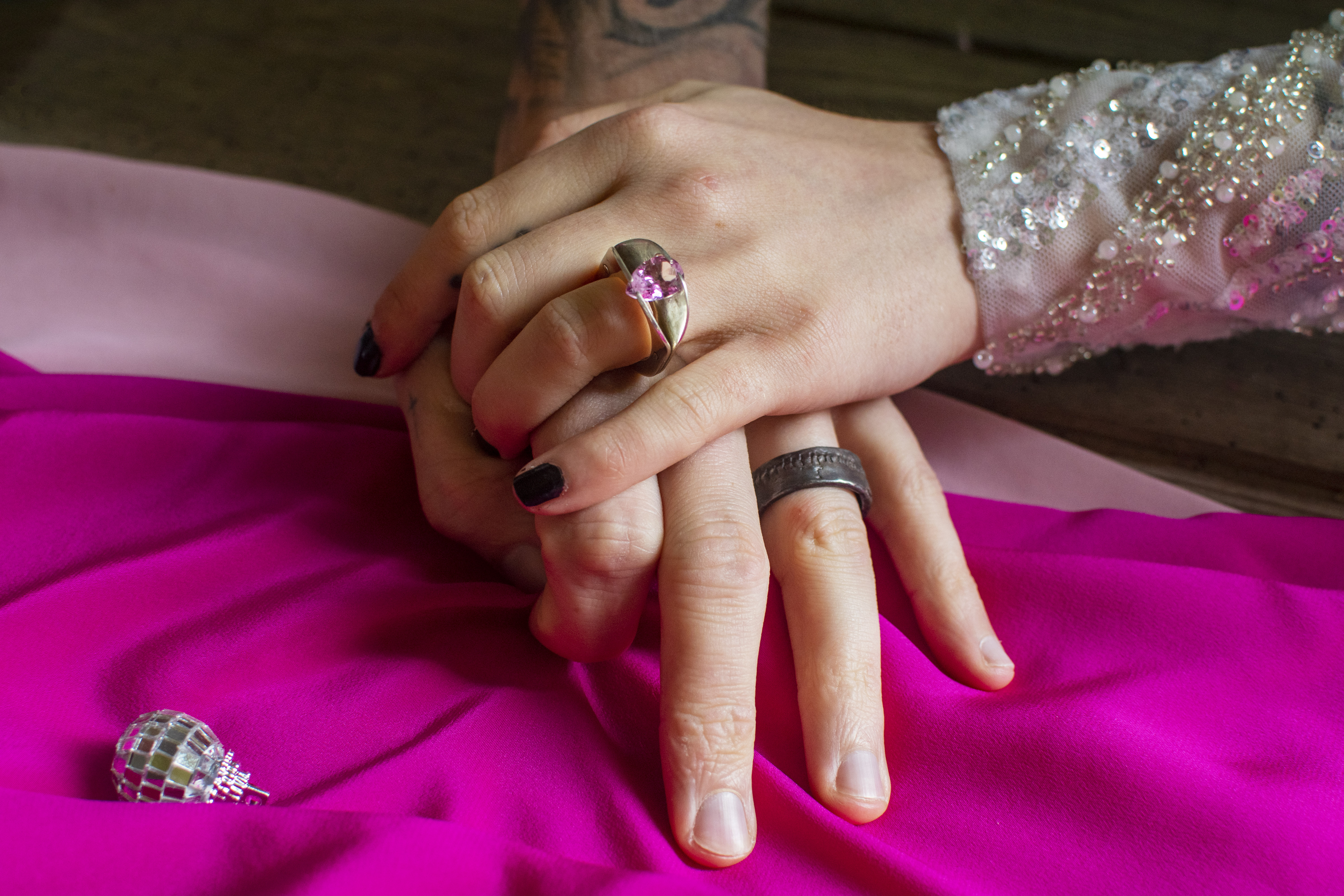 The couple wear assorted earrings and necklace featuring hot pink chalcedony gemstones.