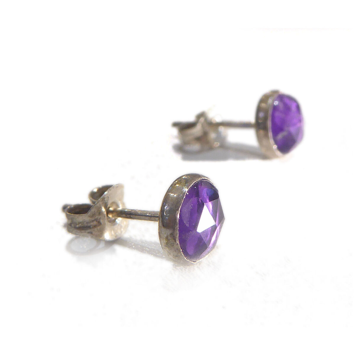 Natural gemstones: 6 mm round faceted amethyst cabochons. The stud earrings close with a butterfly clasp.