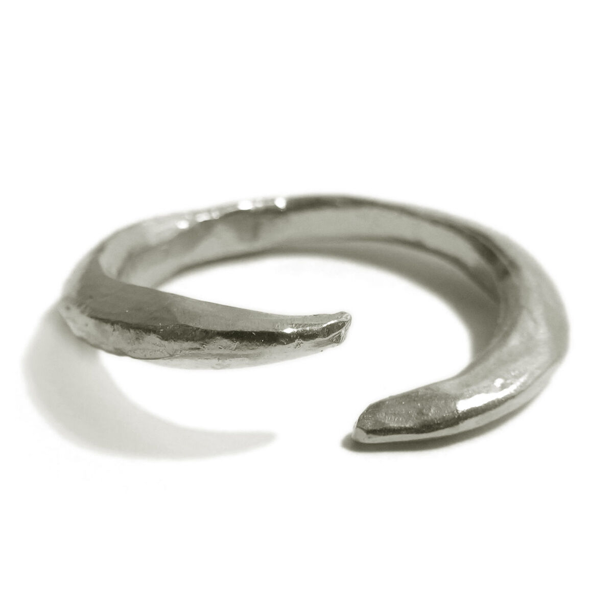 Crafted from recycled 18 ct white gold, this open crossover claw ring is both sculptural and refined, its polished surface catching light like the spark of ambition. The shank’s markings declare the path you intentionally carve.